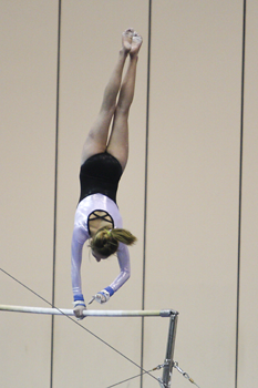 Many indoor sports photos are taken with a wide aperture to compensate for low lighting and fast shutter speed and these gymnastics photos are no exception. The floor routine was taken with a slower shutter speed which resulted in motion blur but the bar image was shot faster and returned better quality.